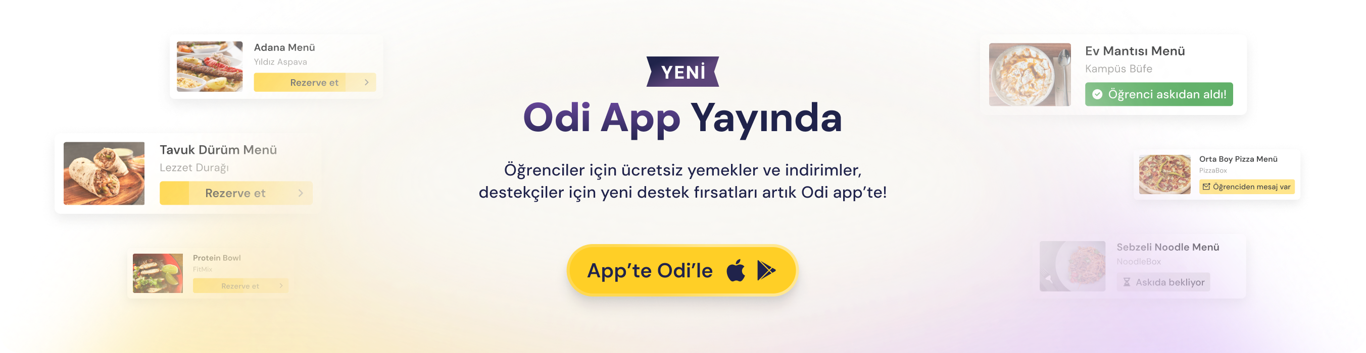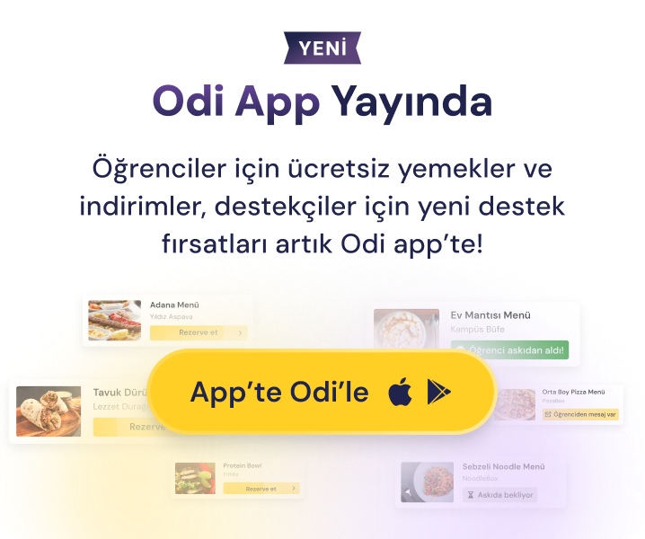 Odi ile üniversite öğrencilerine destek olunuyor. Odi ile öğrenci dostu işletmelerin öğrenciler için indirimli sunduğu menüler destekçiler katkıları ile üniversite öğrencilerine ulaştırılıyor.